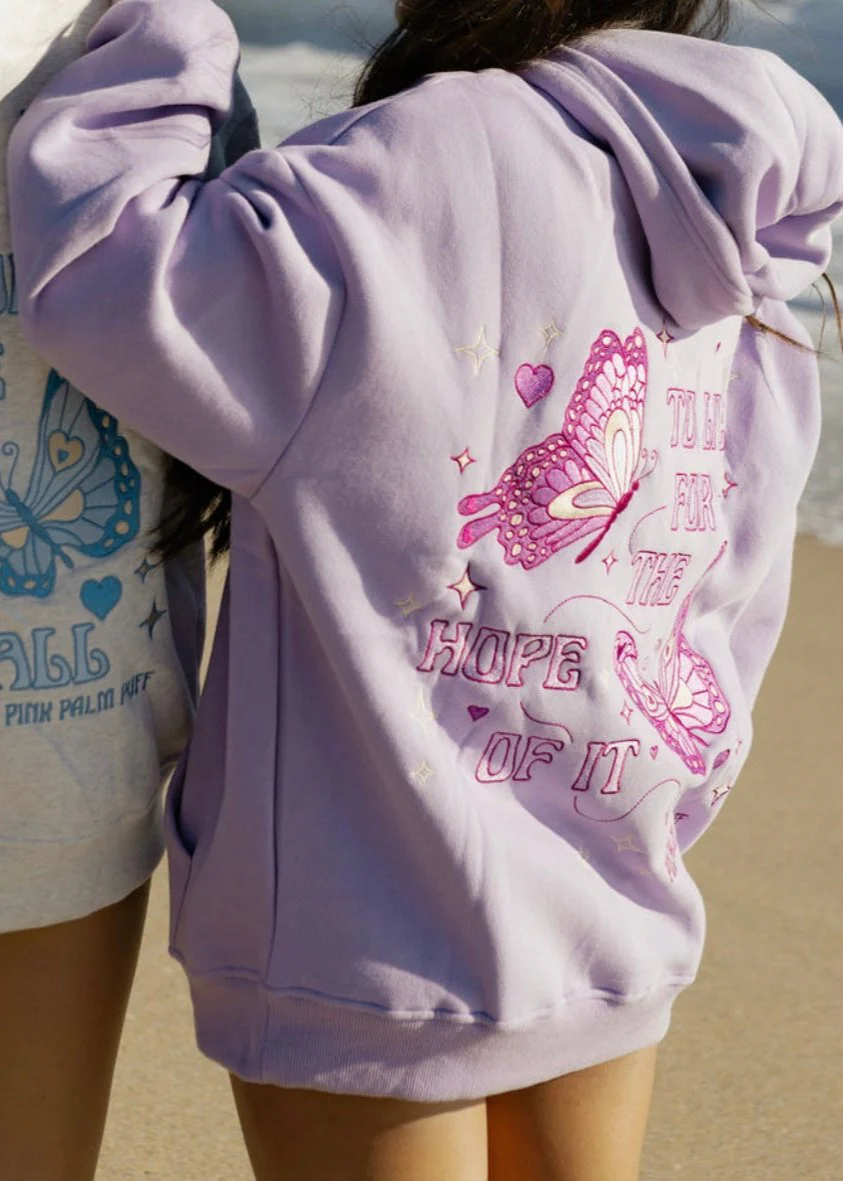 The "To Live For the Hope of it All" Oversized Hoodie is crafted from top-quality fabrics, while having an exquisite embroidery art of fine-detailed butterflies.